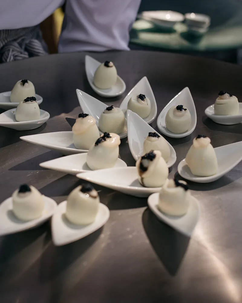 Terralda_Catering Appetisers and Canapés: The reception begins with an abundant selection of cold and hot canapés, carefully curated to balance classic favourites with contemporary touches. Guests enjoy a refined mix of seafood, meat, and vegetarian options, designed to be light, sociable, and visually striking. Highlights include tuna with truffle and avocado, smoked salmon with black sesame, caramelised foie on toast, Iberian pork carpaccio, steak tartare with kimchi mayonnaise, lobster with tomato bread, and crisp pastry bites filled with prawns, sobrasada, or quail egg. A gin and tonic station during the canapé reception adds a relaxed yet sophisticated note to the welcome.