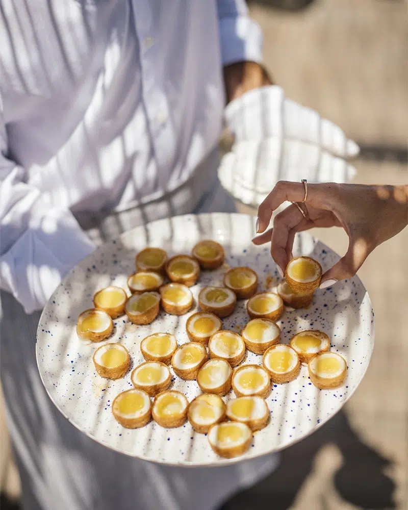 Terralda_Catering Desserts and Evening Bites: Dessert brings a classic yet playful finish, with options such as lemon tart, chocolate fondant, cheesecake with berries, or brioche torrija with caramel and vanilla ice cream. Later in the evening, a recena of mini burgers, empanadas, and toasted sandwiches ensures guests are well looked after as the celebration continues.